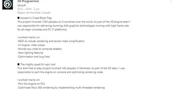 据育碧一名前员工的简历,《刺客信条4:黑旗》由跨越1200人的团队打造,这些团队漫衍于育碧在6个国家的事情室。这名员工示意他认真开发震撼的3A级画面手艺,让《刺客信条4:黑旗》在7个主要平台(PC和主机)上以高帧数运行。