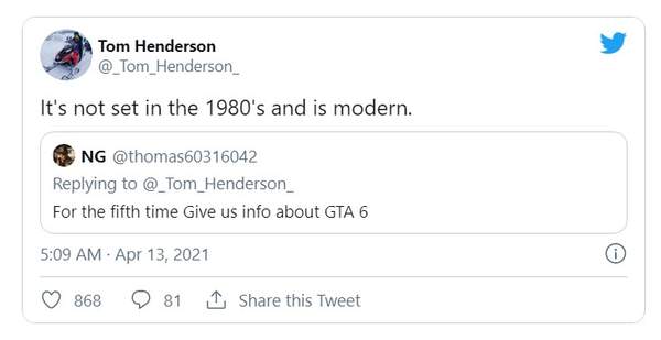 要说玩家最希望在新世代主机上玩到哪款游戏,那一定是《GTA6》,此前有听说称该作设定在70/80年月。不外最近一位大佬推翻了这则传言。Tom Henderson是一位著名爆料人,他曾爆料过《使命召唤》和《战地》系列游戏新闻。克日,他发推特称《GTA6》并非设定在上世纪80年月而是现代靠山。