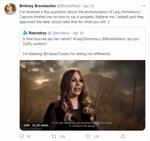 Brittney随后在推特上澄清了这一说法,她示意收到了一些关于她名字发音的问题,并示意卡普空之前已经给她说过若何来正常发音。不外人人可以在游戏中仔细听夫人的名字到底是若何发音的。