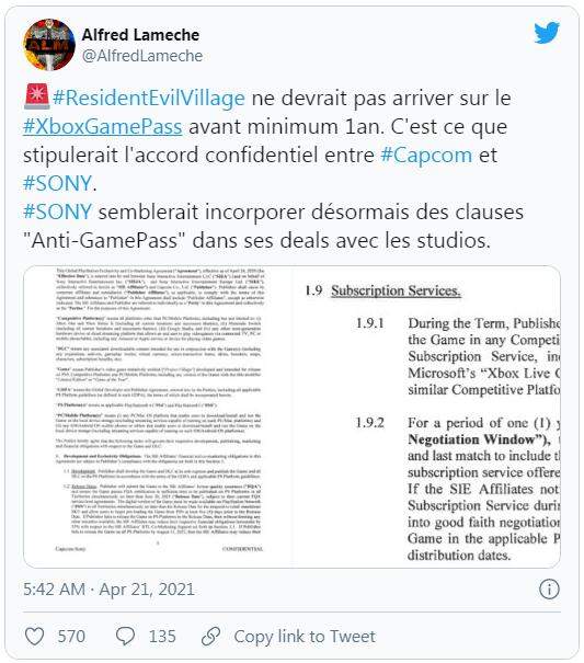 推特网友AlfredLameche日前曝光了一份索尼与卡普空签署的隐秘协议,这两家公司杀青了一个协议,那就是:《生化危急8:墟落》在发售后至少一年之内不能上岸任何竞争对手的订阅服务(好比XGP、Xbox Live Gold、xCloud、Stadia Pro等等)。