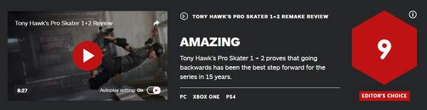 由Vicarious Visions开发的《托尼霍克职业滑板1+2:重制版》已于9月4日正式发售,外媒IGN在体验游戏后给出了相关评测,并打出了9分的好评成绩。IGN评测者表示,倒退是动视近15年来对该系列向前迈出的最好一步,这部作品将再次成为动视公司商业战略的核心支柱。