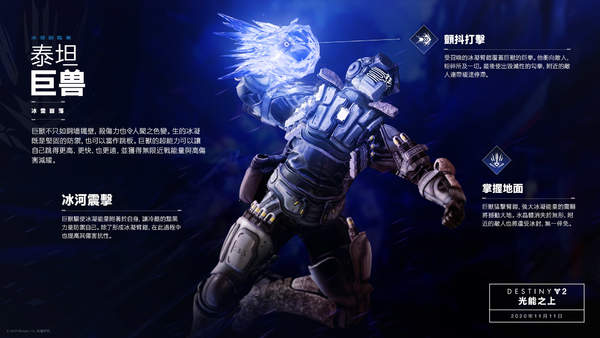 《命运2》最新资料片“凌光之刻”已延期至将今年11月11日上线,在该资料片中玩家们将可选择三个新分支。在公布了术士职业的新分支“影宗”之后,开发商Bungie公布了泰坦职业的新分支——巨兽介绍,官方对该泰坦巨兽的描述为“冰川震击。泰坦巨兽,身披冰冻暗影,具有高攻高防的特性。”