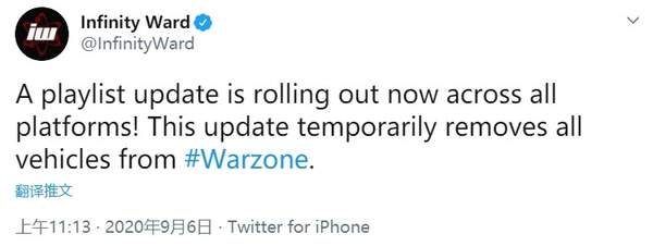 开车导致服务器崩溃的BUG出现了几天后,官方终于在修复了它。今天Infinity Ward官方再次发推,表示漏洞已经修复,在游戏更新之后载具会重新出现游戏之中。其实早在今年5月6日,Infinity Ward就曾因为部分玩家恶意卡bug而短暂移除过直升机。