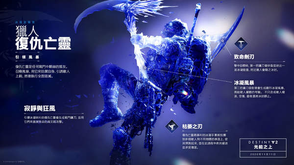 《命运2》最新资料片“凌光之刻”已延期至将今年11月11日上线,在该资料片中玩家们将可选择三个新分支。在陆续介绍了术士职业新分支“影宗”、泰坦职业新分支“巨兽”之后,开发商Bungie在今日公布了最后一个职业分支介绍,猎人职业新分支——复仇亡灵,召唤冰凝之魂并释放暗黑能量来冰封敌人。