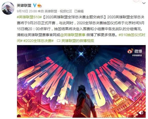 【2020英雄联盟全球总决赛主题交响乐】2020英雄联盟全球总决赛将于9月25日正式开赛,与此同时,2020全球总决赛抽签仪式将于北京时间9月15日晚20:00点举行,抽签结果将决定入围赛和小组赛中各支战队的分组情况。请前往英雄联盟赛事官网或@英雄联盟赛事 微博了解更多信息。
