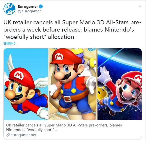 《超级马里奥3D合集》是纪念马里奥35周年推出的合集游戏。任天堂之前就宣布,本作的实体卡带版将在9月18日限量销售,数字版将在2021年3月之前限量发售。最近以低廉的价格而受到玩家们的欢迎英国零售商Base.com取消了网站上所有《超级马里奥3D合集》的预购订单,原因是缺货。