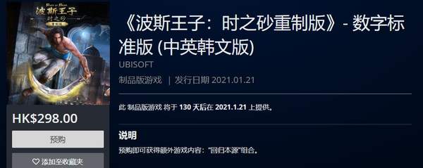 在上周的育碧第二期“Ubisoft Forward”直播发布会上,官方公布了经典动作游戏《波斯王子:时之砂重制版》,随后游戏PC版在Uplay商城同步开启预购,标准版售价198元。日前,Playstation港服商店也随之开启《波斯王子:时之沙重制版》的数字预购,售价298港币(约263人民币),游戏支持中文。