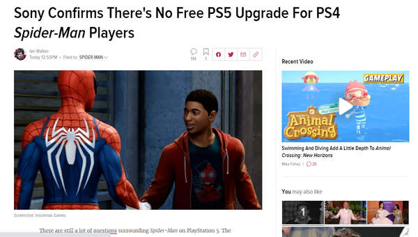 据外媒Kotaku,购买了PS4版《漫威蜘蛛侠》的玩家仍然不能免费升级到PS5复刻版游戏。索尼官方向他们确认了这一点。游玩PS5复刻版《漫威蜘蛛侠》的方式就是: