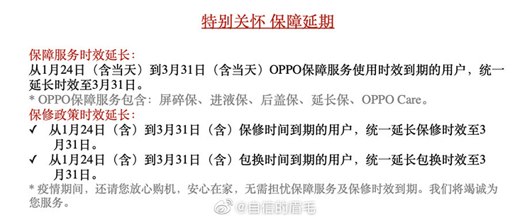 OPPO这边也由副总裁沈义人(微博名自信的眉毛)在微博宣布了全新的保修政策,为阻止OPPO用户在疫情时代处于保修期内的OPPO产物泛起问题后无法实时送修,导致产物过了保修期从而不能保修,OPPO决议延伸用户的产物保修时效,并会凭证新型冠状病毒疫情的生长情形随时做出调整更新。