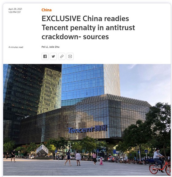腾讯将因反垄断被处以至少100亿元罚款