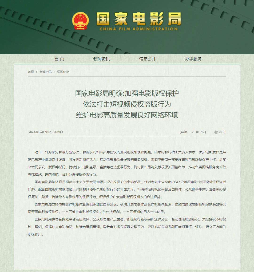 国家电影局:加强电影版权保护打击短视频侵权