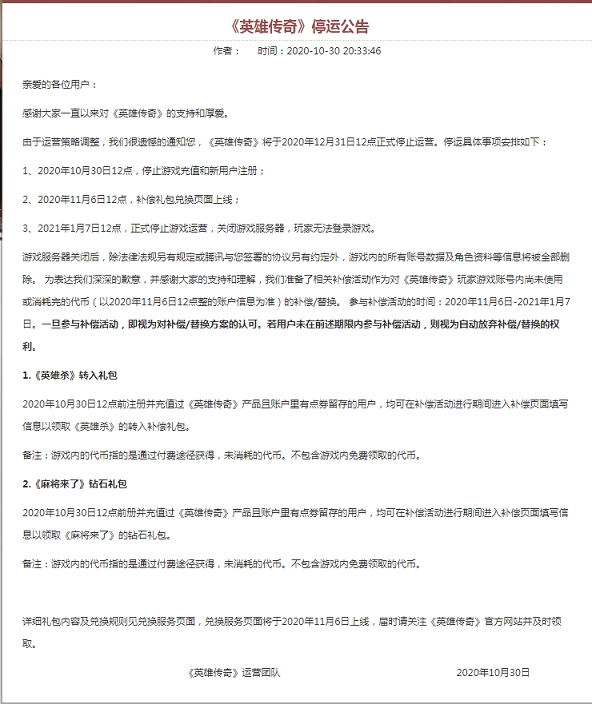 腾讯发布《英雄传奇》《梦想召唤王》停运公告
