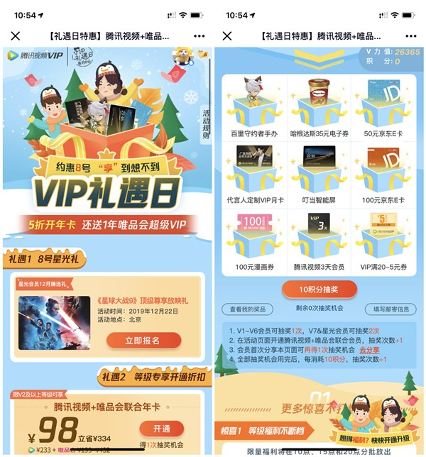 腾讯视频会员礼遇日抽50-100元京东E卡 3-30天VIP
