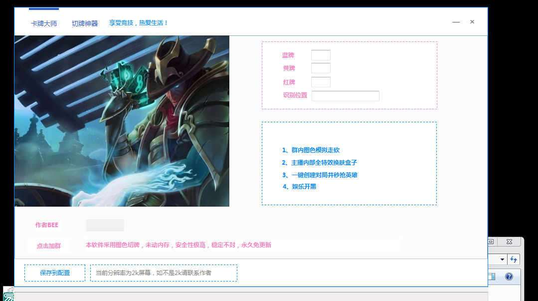 使用本软件游戏的设置要求 ----需要游戏使用全屏窗口化模式(无边框模式) ----需将游戏内切牌技能w键改成z键 ----需右键管理员模式打开本软件 1、演示如何改键(默认可不改)改键后点保存 重启软件才有效 2、演示如何设置识别范围 注意保留的位置 再演示一次 ,点完抓图 选w技能获得位置,然后点回车 将获得的位置坐标复制粘贴到软件内(软件内原坐标需删除),点保存 3、利用工具更新卡牌 卡牌储存的路径 C:\date 准备手捏牌的界面 蓝牌 红牌 黄牌 四个牌全更新完了,截第三步的时候 截中间一点就行 尽量截代表性颜色 小一点 更灵敏 打开软件就可以用了 以上设置最多三分钟但可大幅度提升识别准确率 程序更新不需要第二次设置 1, 本软件采用图色切牌,未动内存,不封。 2,目前支持所有分辨率屏幕,需按照教程设置 |
