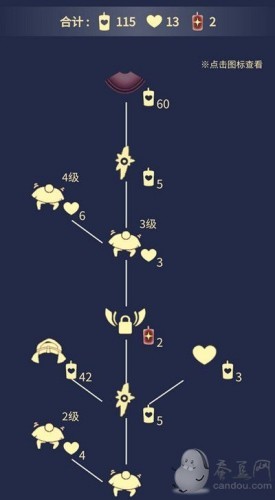螃蟹先祖带来的物品较多,除了兑换树主线设置了6层之外,还有四个分叉:解锁动作的所需两个树杈,其余的两个分叉分别是需要42根蜡烛才能兑换的螃蟹帽子和一颗心。