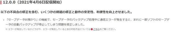 今日,任天堂宣布Switch系统更新大版本号12.0.0上线,这次更新并没有主要的内容,只是修复了一个存档功效BUG。此前在少数情形下,存档数据备份的历程中泛起毗邻错误时,会中止存档自动备份。现在官方对这个问题举行了修复,此外另有每次更新都有的保留项目,提升稳固性。