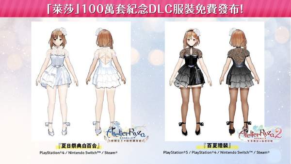此外,为纪念《莱莎的炼金工房》与《莱莎的炼金工房2》全球累积出货量突破100万套,《莱莎的炼金工房》稀奇服装DLC“夏日祭典白百合”与《莱莎的炼金工房2》稀奇服装DLC“百夏礼装”将于日后免费宣布,敬请期待。