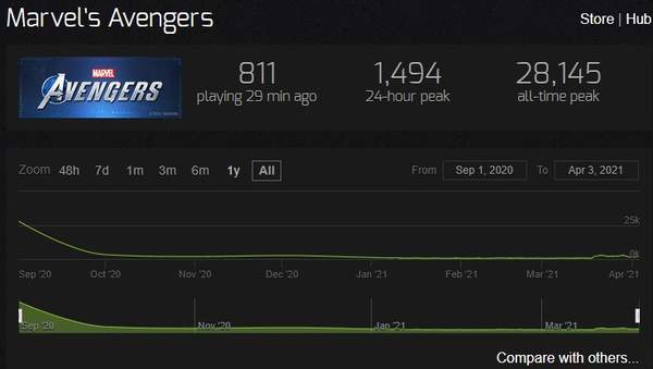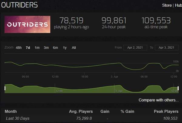 Square Enix科幻FPS新作《先驱者》于4月2日在Steam解锁发售,几小时内通过Steam平台的嬉戏人数峰值就已经靠近11万,远超此前SE《漫威复仇者同盟》同时期仅3万玩家的数据。以上仅为SteamDB的统计效果,而本作的首发阵容中有Xbox Game Pass主机版,想必本作在PC以外的平台热度一定也会不低。