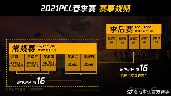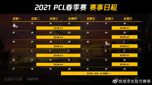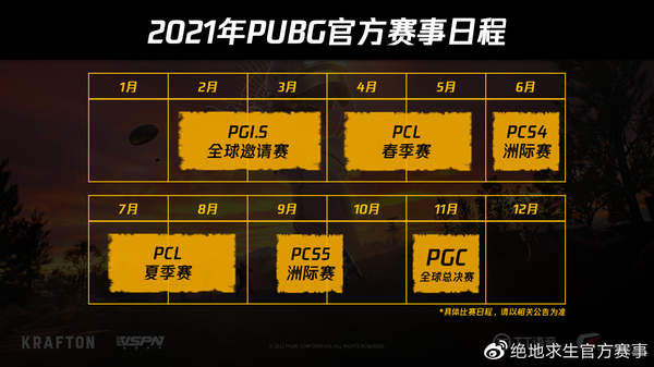 2021年,绝地求生冠军联赛赛事组织委员会(以下简称“PCL赛事组委会”)设计举行两届联赛,PCL春季赛将于4月中旬举行,PCL夏日赛将于7月下旬举行。每届联赛为期6周,经由猛烈比拼,将为PCS东亚洲际系列赛连续运送最强PCL俱乐部。