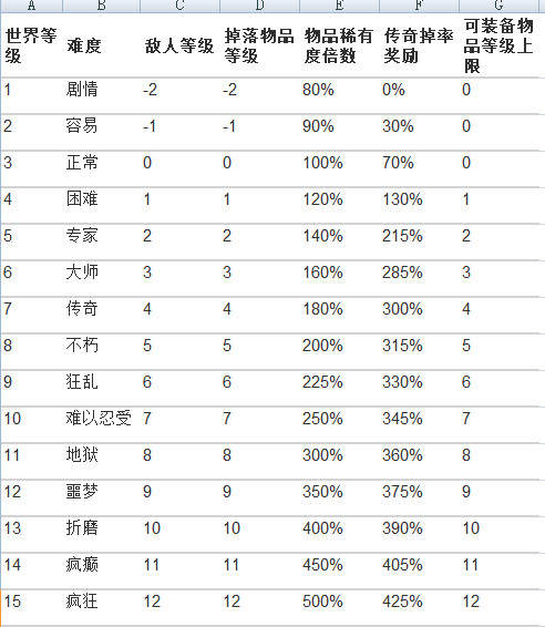 《先驱者》天下品级共有15个,15级是最高级,掉落物品品级为12级,物品有数度倍数是”正常“难度的五倍,传奇装备掉率奖励也更高。
