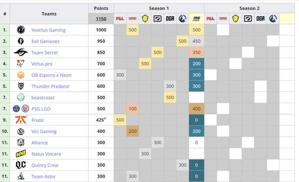 4.Aster战队 300分(联赛第二300+Major第九0分),Aster战队300分现在排名并列11,必须下一个联赛和Major有好的成就,否则这个分数是一定会被挤出前12