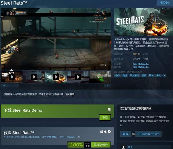 作为一名资深游戏宅,随时掌握Steam、Epic、GOG等平台的夏日特卖、冬季特卖以及每周特惠等优惠资讯应是基本手艺,今天小编为人人带来新一轮喜加一游戏资讯。现在2.5D动作街机游戏《Steel Rats》在Steam开启免费领取流动,游戏支持简体中文,总体评价批判纷歧,玩家可在4月5日上午1:00前免费获取。